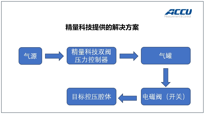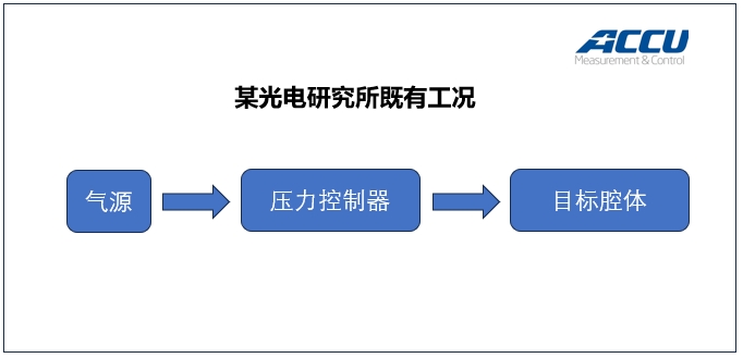 基于該光電研究所提供的工況及細(xì)節(jié),精量科技的技術(shù)負(fù)責(zé)人提供一套定制化的解決方案: 從氣源到目標(biāo)控壓腔體之間,除了雙閥壓力控制器外,分別增加一個2L的氣罐和一個電磁閥。